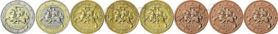 2€, 1€, 0'50€, 0'20€, 0'10€, 0'05€, 0'02€ y 0'01€: Escudo de armas de la República de Lituania.